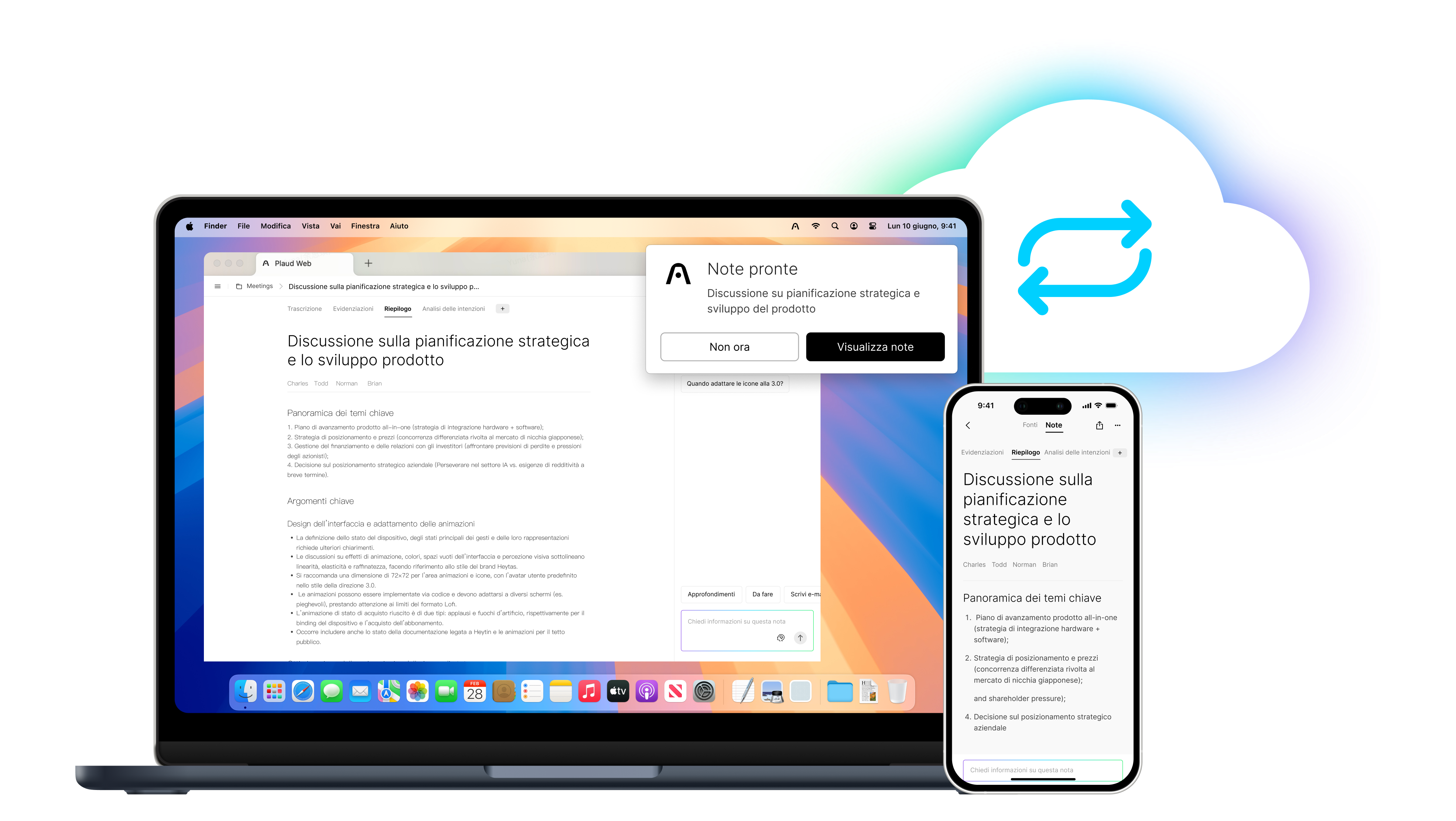 Cattura ogni suono con il registratore di appunti con IA Plaud e accedi a registrazioni, trascrizioni e sintesi da app, web e desktop, con spazio illimitato nel cloud protetto.