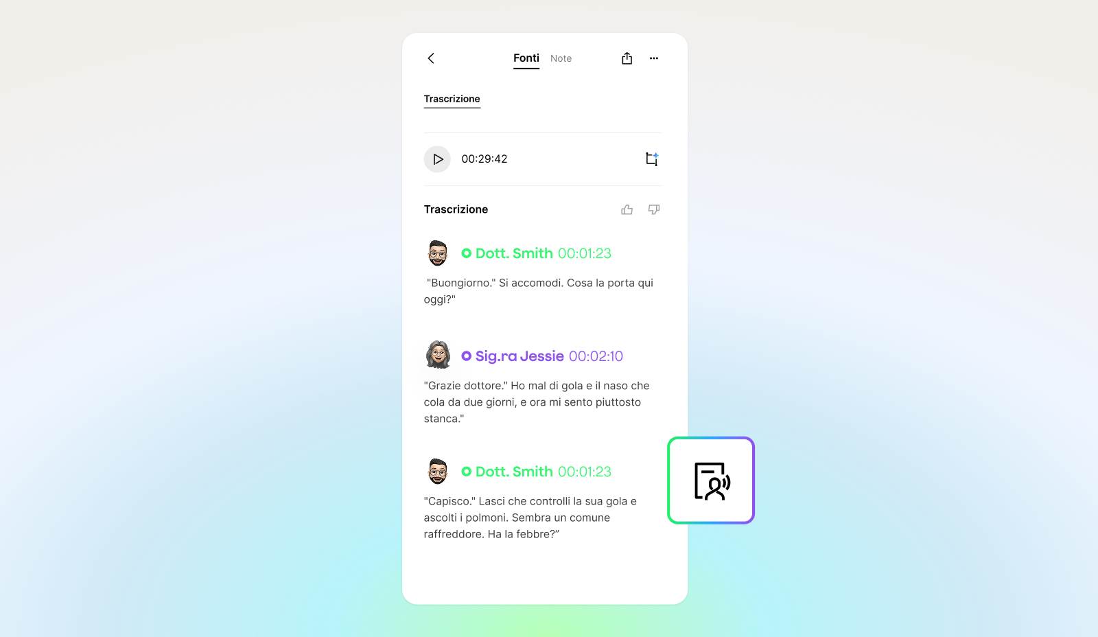 Grazie alla diarizzazione AI, ogni voce viene distinta con precisione: dal dubbio del paziente alla raccomandazione del medico, tutto è chiaro e attribuito correttamente.