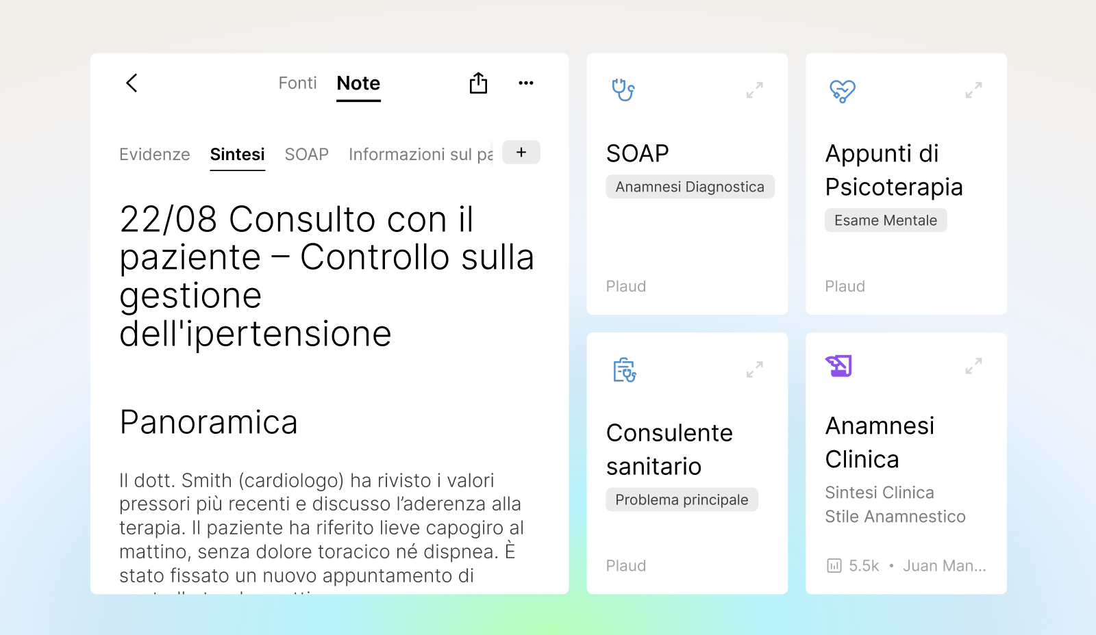 Plaud trascrive con precisione i tuoi consulti - inclusi i termini specifici del settore - e genera note SOAP e riepiloghi da diverse prospettive. Ottieni immediatamente una documentazione strutturata e conforme, così da poterti concentrarti sulla cura dei pazienti anziché sulle scartoffie.
