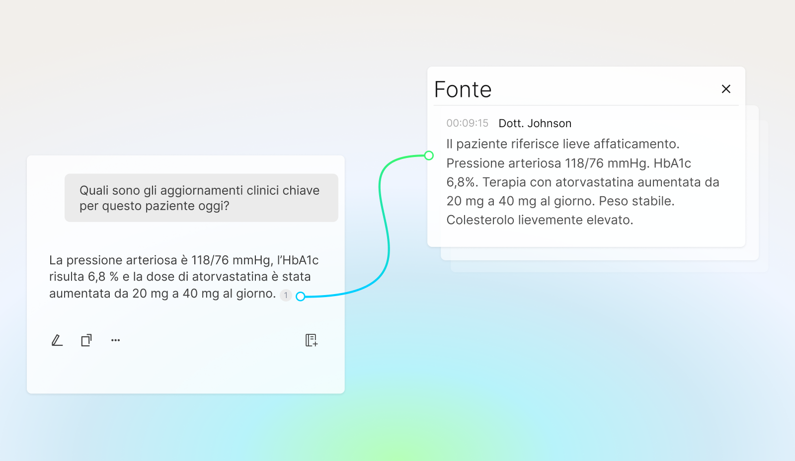 Esporta riepiloghi strutturati per la reportistica, condividili in modo sicuro con i team di assistenza e collegati senza sforzo con il tuo EMR, strumenti amministrativi o di flusso di lavoro.