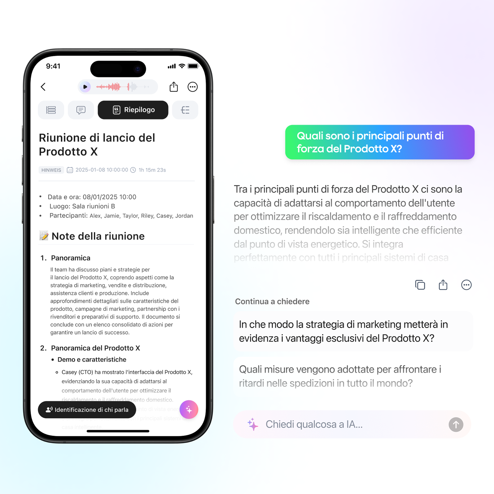 Smetti di annotare tutto e rimani coinvolto nelle riunioni.Con Plaud Note, puoi partecipare alla discussione mentre l'app si occupa di catturare, riepilogare e visualizzare per te le decisioni principali, le azioni da intraprendere e gli approfondimenti.